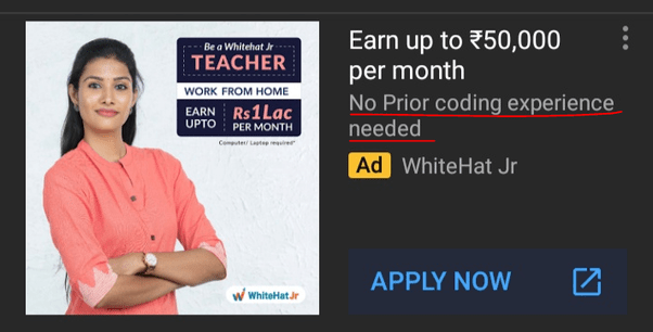 The actors/celebrities and sportspersons are paid in the lakhs, if not crores to proudly (and fakely) say that their kid is a champion because he/she learnt coding on WhiteHat Jr. And in today’s modern age of capitalism, who wouldn’t want to do something as long as they get money, right? Don’t fall prey to these misleading advertisements.