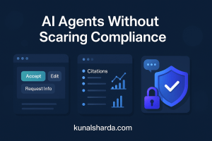 - Three Ways To Use AI Agents Without Scaring Complianceby kunalshardaPractical patterns that pass audits and actually cut work TL;DR Most AI failures in regulated teams are not technical. They are governance failures. If control is visible, Compliance becomes an ally. I use three patterns again and again: Wrap them with simple risk tiers, shared telemetry, and basic change control. You will move fast and… Read more: Three Ways To Use AI Agents Without Scaring Compliance